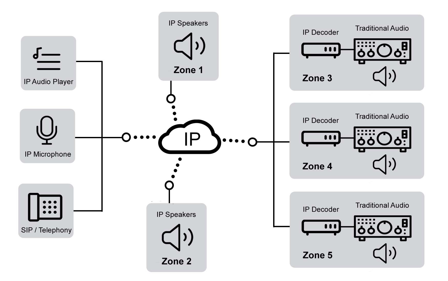 Audio over IP (AoIP) is a newer audio technology that allows us to connect some or all of the audio device entities to the IT network infrastructure. For example, an IP microphone or IP speaker can be connected to an existing network port without requiring any additional cabling. Such topology arrangement can provide improved flexibility and scalability as well as control and management not available with traditional audio.