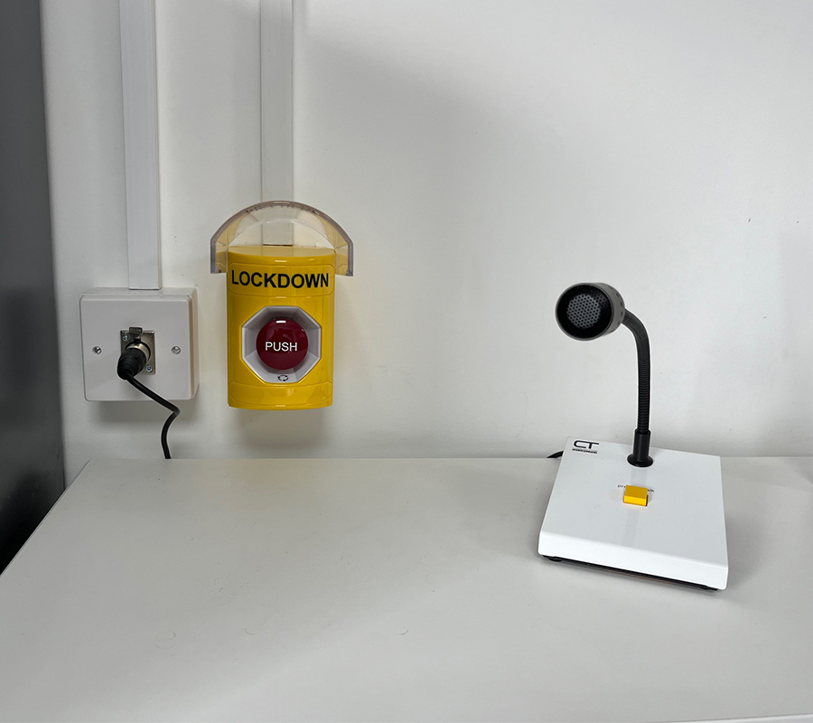 Security and ‘lockdown’ was integrated to the academy sound system by using a series of dedicated lockdown wall buttons. These button units are designed specifically with a protective front hinge lid to prevent accidental pressing. The lockdown buttons were installed at strategically positioned points as directed by the school management.